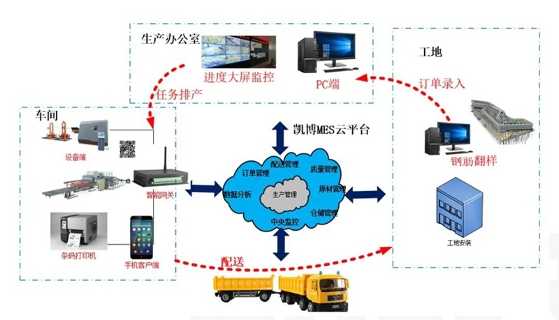 并且,凱博科技攜手中國鐵道科學(xué)研究院集團(tuán)有限公司,開發(fā)凱博鋼筋加工管理軟件系統(tǒng)和鋼筋加工遠(yuǎn)程控制系統(tǒng),打造智能控制中心。鋼筋加工管理軟件系統(tǒng)以鋼筋加工過程中物資流管理為核心,借助工業(yè)互聯(lián)網(wǎng)、云服務(wù)、智能設(shè)備等技術(shù)手段,實(shí)現(xiàn)多項目多任務(wù)遠(yuǎn)程訂單管理,實(shí)現(xiàn)訂單排產(chǎn)、生產(chǎn)訂單分發(fā)、生產(chǎn)標(biāo)牌打印、成品完成報工,成品出入庫等功能,同時能夠以電子大屏實(shí)現(xiàn)項目訂單動態(tài)實(shí)時監(jiān)控、加工廠整體運(yùn)營狀態(tài)的中心化顯示。鋼筋加工遠(yuǎn)程控制系統(tǒng),可實(shí)時顯示加工場各種設(shè)備生產(chǎn)狀態(tài),同時實(shí)現(xiàn)中控室對現(xiàn)場設(shè)備啟動和停止的遠(yuǎn)程控制,造就了高鐵梁場鋼筋加工數(shù)字化新模式!