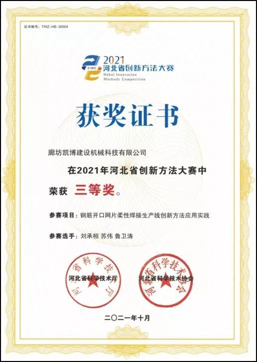 廊坊凱博建設(shè)機(jī)械科技有限公司完成的“鋼筋開口網(wǎng)片柔性焊接生產(chǎn)線創(chuàng)新方法應(yīng)用實(shí)踐”項(xiàng)目在2021年河北省創(chuàng)新方法大賽中榮獲三等獎(jiǎng)。